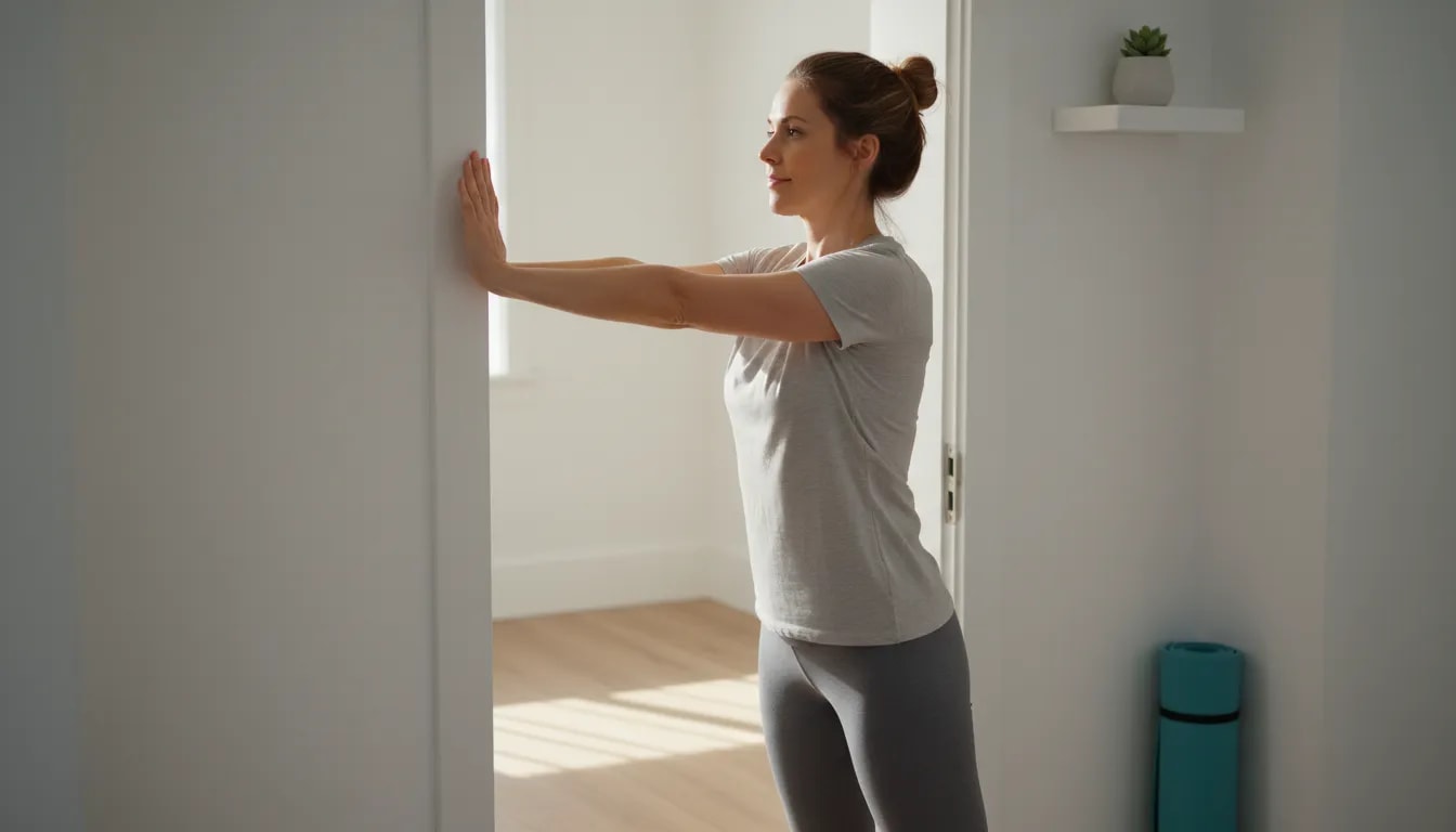 Persona haciendo un estiramiento en el marco de la puerta para abrir el pecho y corregir hombros adelantados, en un salón luminoso con planta y colchoneta, mostrando alivio del dolor de espalda